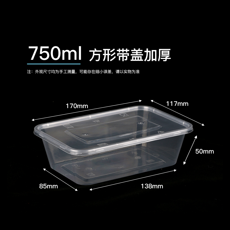 一次性饭盒长方形圆形塑料水果外卖快餐便当打包盒保鲜加厚带塑 750ML方形加厚带盖*20盒