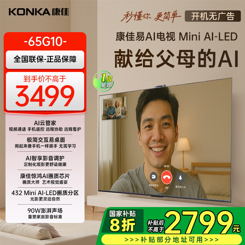 康佳电视65G10 65英寸 易AI电视机 惊鸿AI画质芯片 低反屏 Mini LED 多分区 液晶智能平板