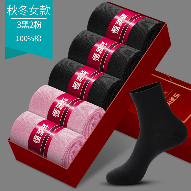 恒源祥袜子男纯棉黑色中筒袜防臭吸汗四季商务男袜全棉袜秋冬厚款_148 均码 秋冬女款-3黑2粉