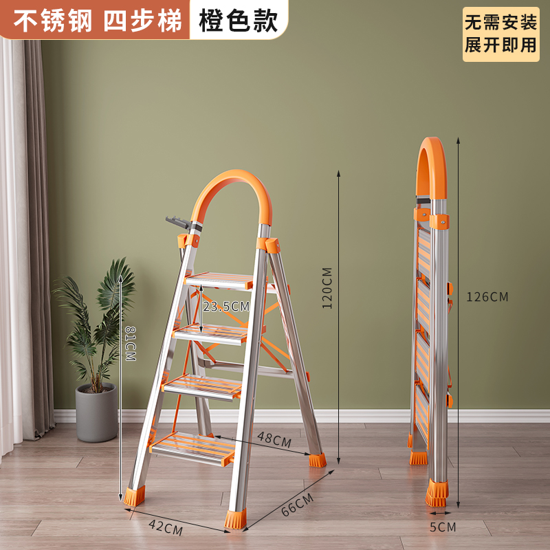 梯子家用折叠伸缩室内楼梯人字梯多功能加厚升降不锈钢五步梯爬梯 不锈钢4步加厚防滑暖橙色加固铝合金踏板