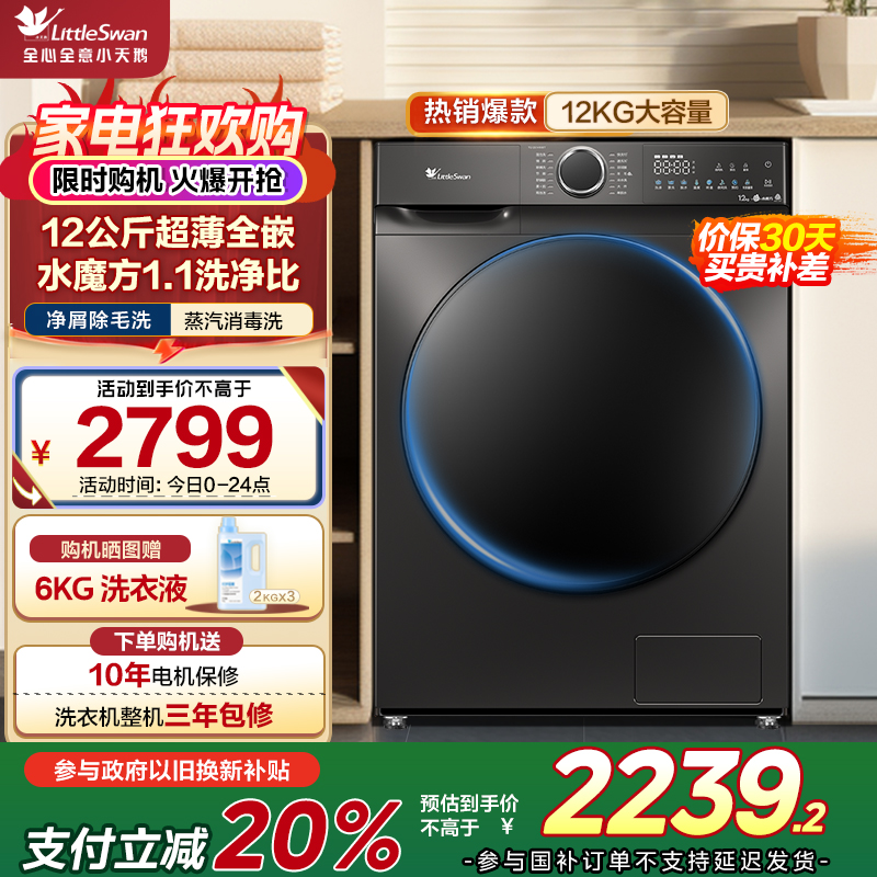 小天鹅(LittleSwan)滚筒洗衣机全自动家用12公斤大容量一级变频银离子除菌水魔方护色护形TG120V618T