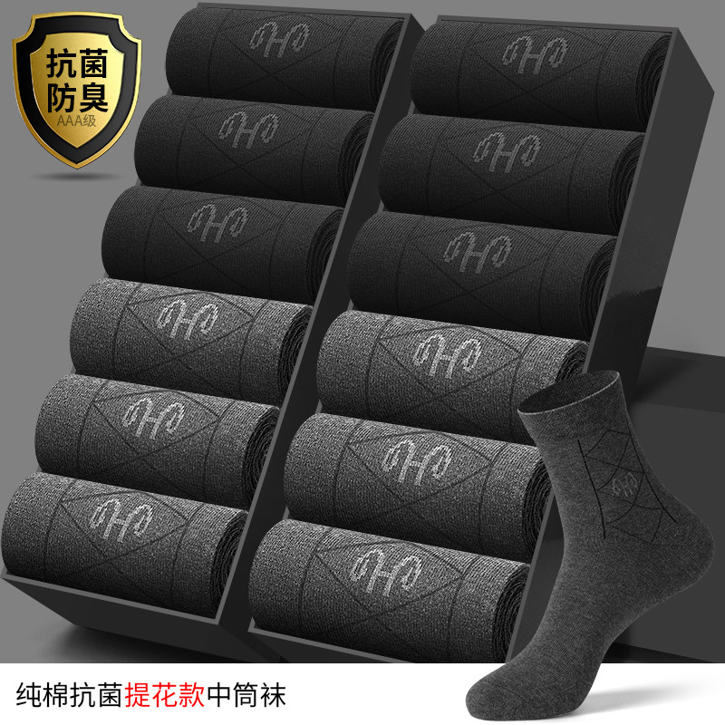 恒源祥袜子男士纯棉中筒秋冬季加厚款防臭吸汗长筒长袜运动全棉袜_435 均码【纯棉袜收藏加购|闪电发货】 纯棉抗菌提花款【6深灰/6黑色】共12双