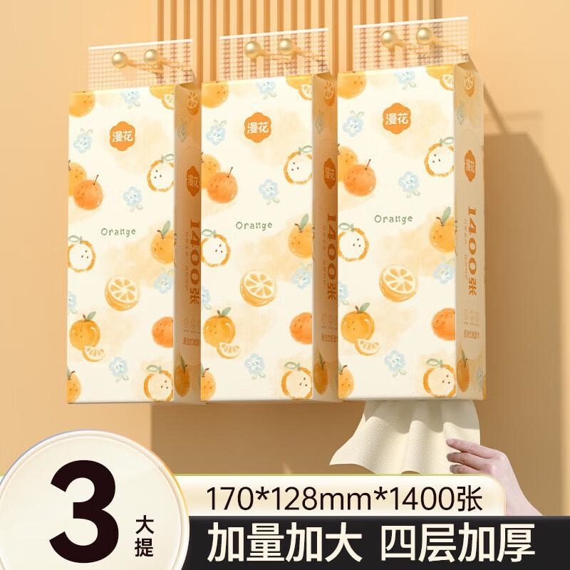 漫花悬挂式大抽纸1400张×3大提整箱抽纸底部抽竹浆纸巾纸抽加厚 漫花橘子挂抽1400张*3提