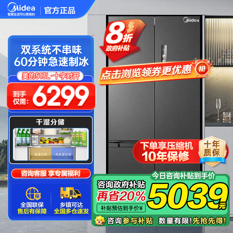 美的(Midea)M60系列513升十字门双系统超薄全嵌制冰机风冷无霜冰箱以旧换新MR-539WUSIPZE海贝黛