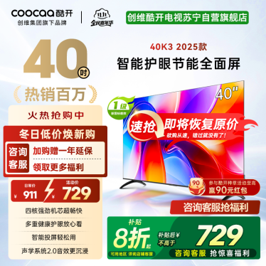 创维酷开电视K3 2025款 40英寸 一级能效 多重健康护眼全面屏智能投屏电视 40P3F