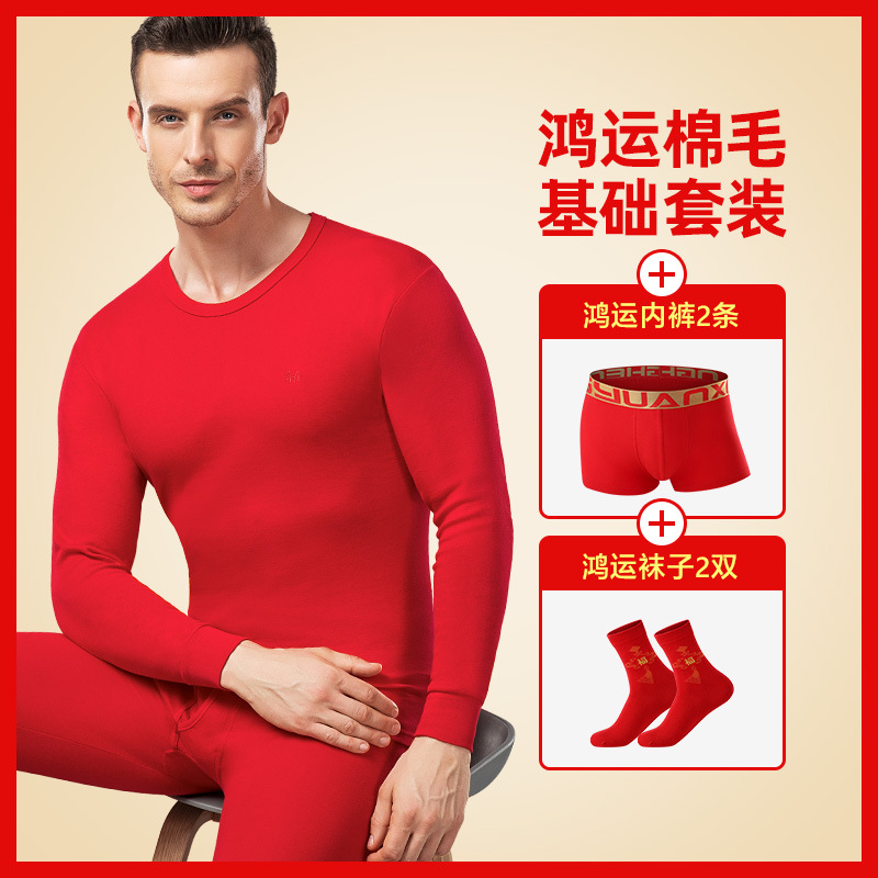 恒源祥本命年套装大红色结婚男士保暖内衣纯棉情侣秋衣秋裤女_48_97 180(XXL) 鸿运男套(鸿运纯棉套装+内裤2条+袜子2双