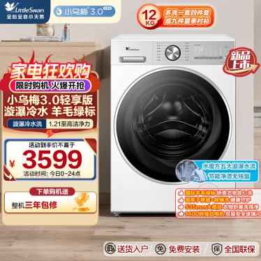 小天鹅全自动12kg极地白滚筒洗衣机TG12VE10PRO 1级能效节能四口之家水魔方除螨洗