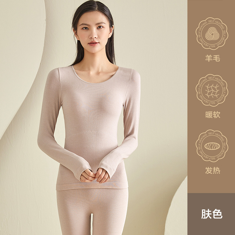 恒源祥保暖内衣女德绒发热美体紧身秋衣秋裤加厚羊毛贴片打底套装_676 均码 肤色