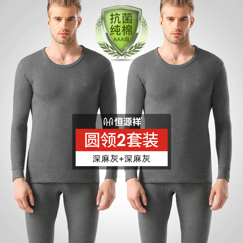 恒源祥保暖内衣男士秋衣裤秋裤套装青少年春秋薄款男生全棉毛衫冬_729_181 XL/175【AAA抗菌100%纯棉】 【圆领】深灰+深灰