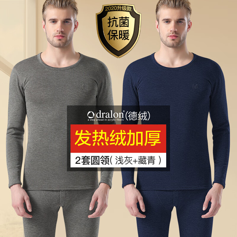 恒源祥男士套装加绒加厚德绒锁温保暖内衣纯棉秋冬季抗寒防风男款_494_164 175(XL) 2套装圆领【德绒加厚】浅灰色+藏