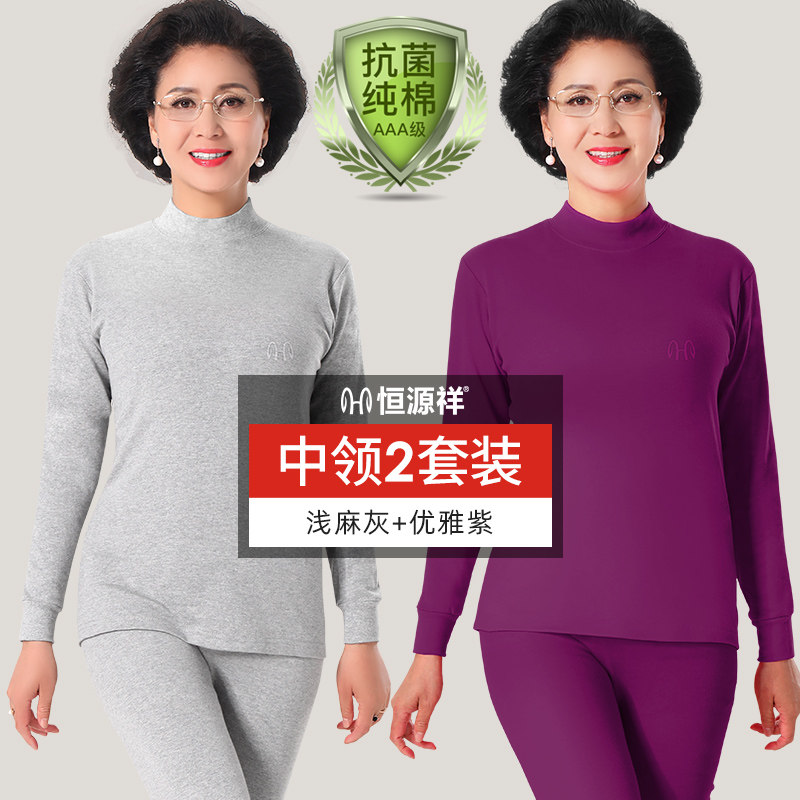 恒源祥纯棉女士保暖内衣套装中老年人秋衣裤冬季薄款秋裤全棉毛衫_963_336 165/M AAA抗菌【中领】浅灰+优雅紫