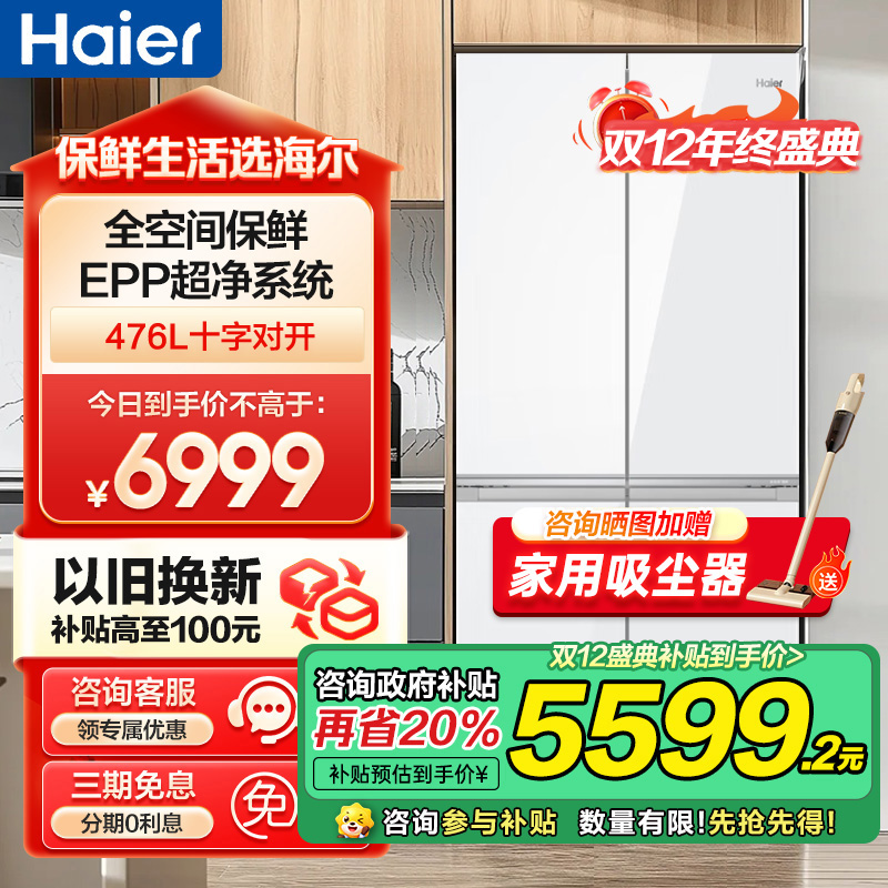 海尔(Haier)冰箱549升十字对开门四开门双系统防串味EPP超净除菌家用一级能效风冷无霜大容量带制冰盒AI节能省电