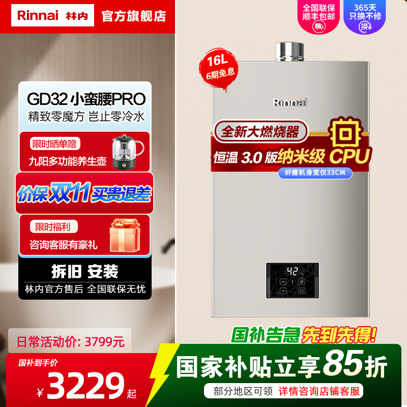 [小蛮腰Pro系列]林内(Rinnai) 16升燃气热水器 16GD32变频恒温天然气强排家用gd31防冻防风