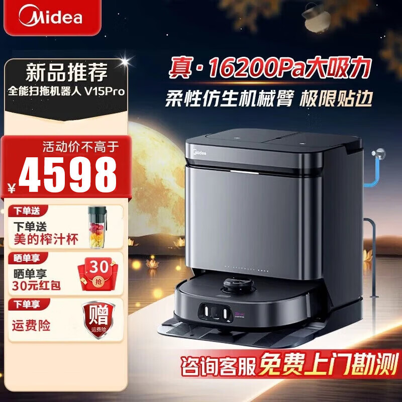 美的[重磅新品]扫地机灵眸V15Pro扫地机器人炭灰色上下水版扫拖洗烘一体全自动柔性机械臂毛发克星