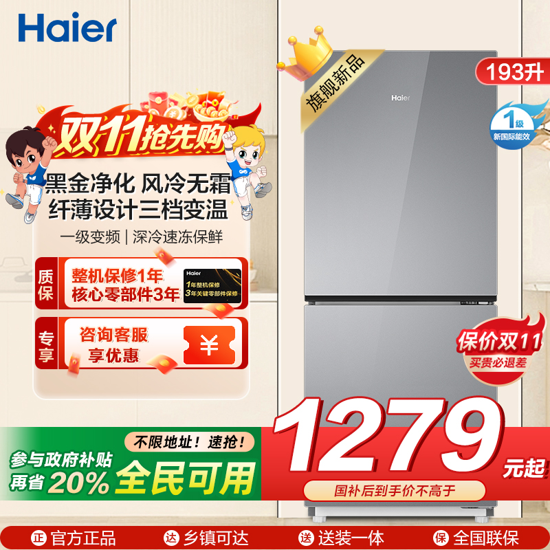 海尔(Haier)193升 纤薄设计三档变温 黑金净化一级变频风冷无霜 BCD-193WGHC2E7AS