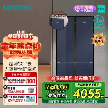 西门子[十字星系列玻璃门]线下同款497升四开门变频冰箱 60.9cm超薄机身微平嵌 支持国家补贴 KC82EA256C