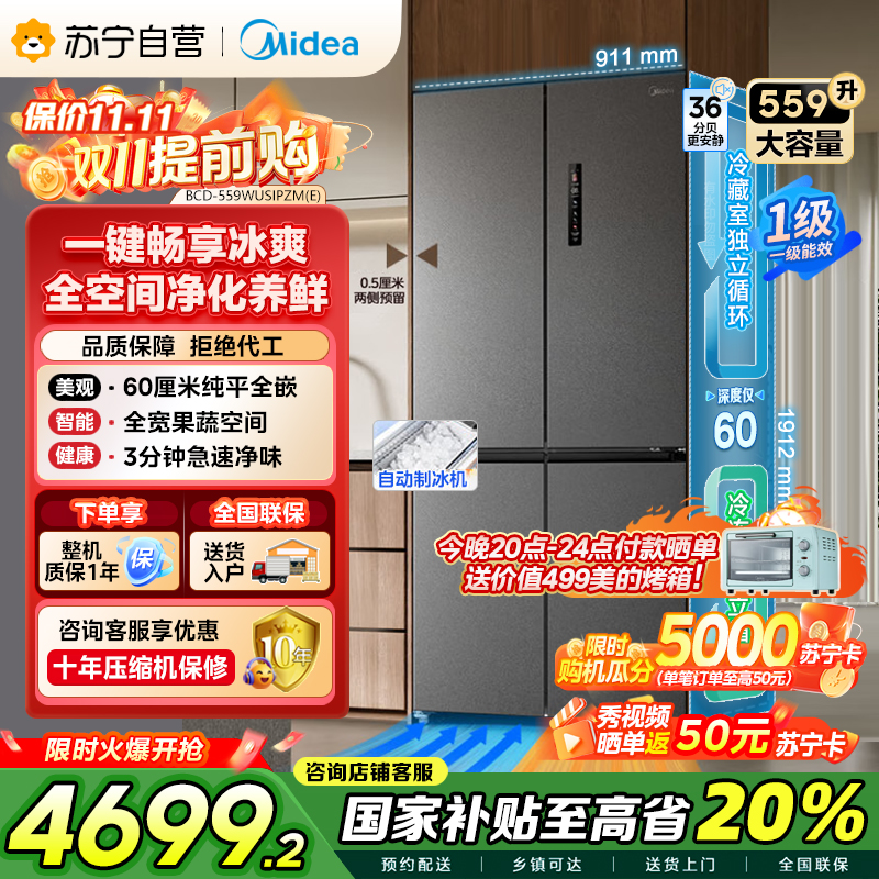 美的(Midea)559十字四门多开门独立制冰超薄全嵌变频风冷无霜PST+净味BCD-559WUSIPZM(E) 幻影砂