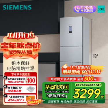 西门子 306升风冷无霜三门家用冰箱 家电国家补贴以旧换新 三开门 大容量 锁水保鲜 双效过滤 KG32HA26EC