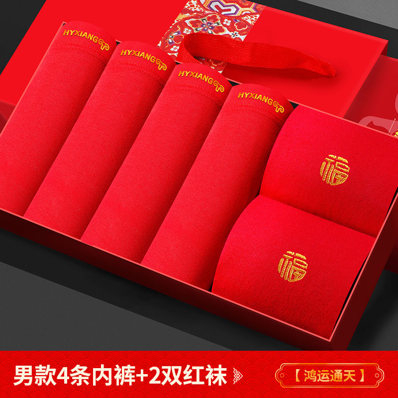 恒源祥男士本命年红内裤男纯棉大码平角裤透气结婚礼盒装四角裤潮 3XL185/110 【鸿运通天】4条装+2双红袜