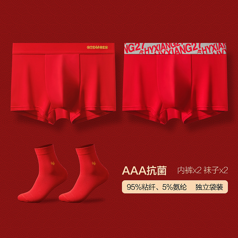 恒源祥本命年内裤男士平角裤纯棉大红色属虎年结婚四角短裤头_22 170/L 【2内裤2袜子】大运亨通