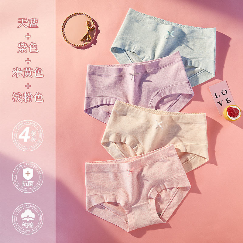 恒源祥女士内裤女纯棉棉透气夏季薄款中腰少女无痕三角裤头 160/M 天蓝+紫色+米黄色+浅粉色