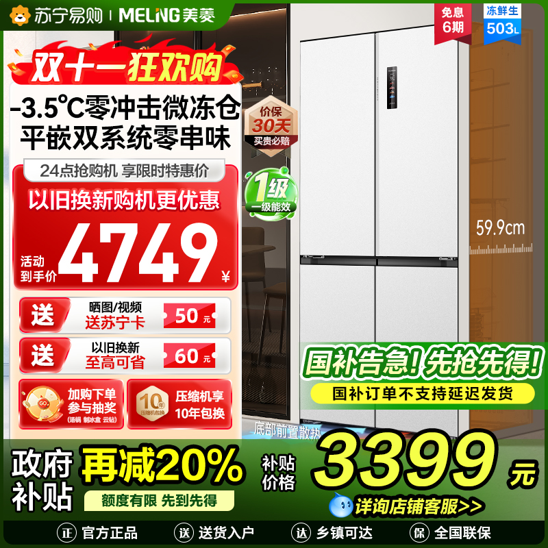 美菱(MeiLing)AI冰箱503十字四门对开门59.9cm深双系统零平嵌超薄除菌除病毒保鲜大容量一级省电冰箱国家补贴