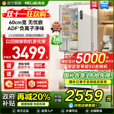 美菱(MeiLing)小确杏401升法式冰箱小户型家用底部散热60cm宽超薄窄门嵌入式风冷政府补贴BCD-401WFP9