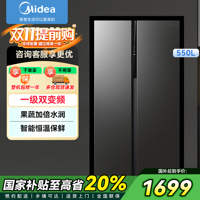 美的(Midea)550L冰箱对开门双开门一级能效双变频风冷无霜大容量冷藏冷冻家用智能冰箱BCD-550WKPZM(E)