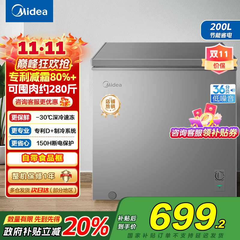 美的(Midea)小冷柜200升 减霜家用囤货 一级能效冰柜母婴母乳小冰箱 BD/BC-200KMF(E)以旧换新