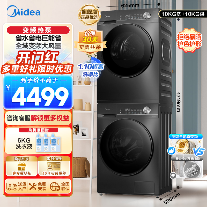 美的(Midea)洗烘套装 10KG滚筒洗衣机+变频热泵烘干机 1.1洗净比MG100V36T+MH100VH36T