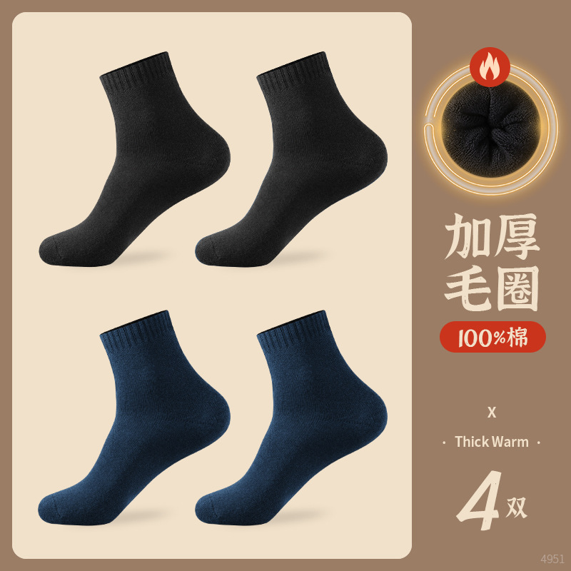 恒源祥男士袜子冬季棉袜中长筒纯棉加绒加厚保暖毛圈袜男袜子冬天_49 均码【100%纯棉,加厚保暖】 4951【2黑色2藏青】毛圈男袜4双