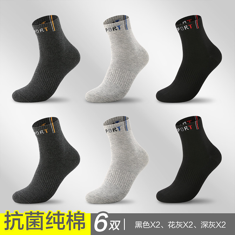 恒源祥袜子男中筒袜纯棉防臭吸汗秋季全棉篮球运动跑步长袜春秋款_845 均码【39-44码】运动防滑100%纯棉 【纯棉抗菌中筒款】2黑色/2花灰/2深灰A