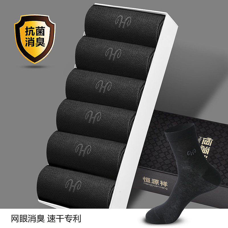 恒源祥袜子男士纯棉中筒春秋夏季吸汗薄款透气夏天棉长筒袜_532 均码 【透气网眼、抗菌纯棉】6黑色