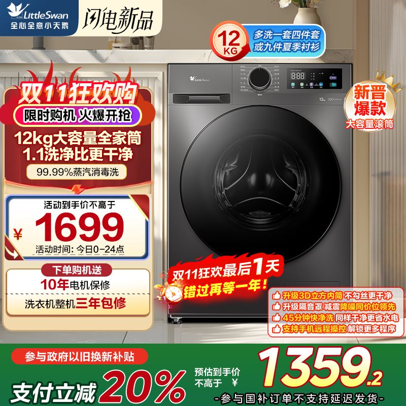 小天鹅(LittleSwan)12KG大容量变频全自动滚筒洗衣机 节能省电蒸汽消毒洗 一级能效 TG120V098WDT
