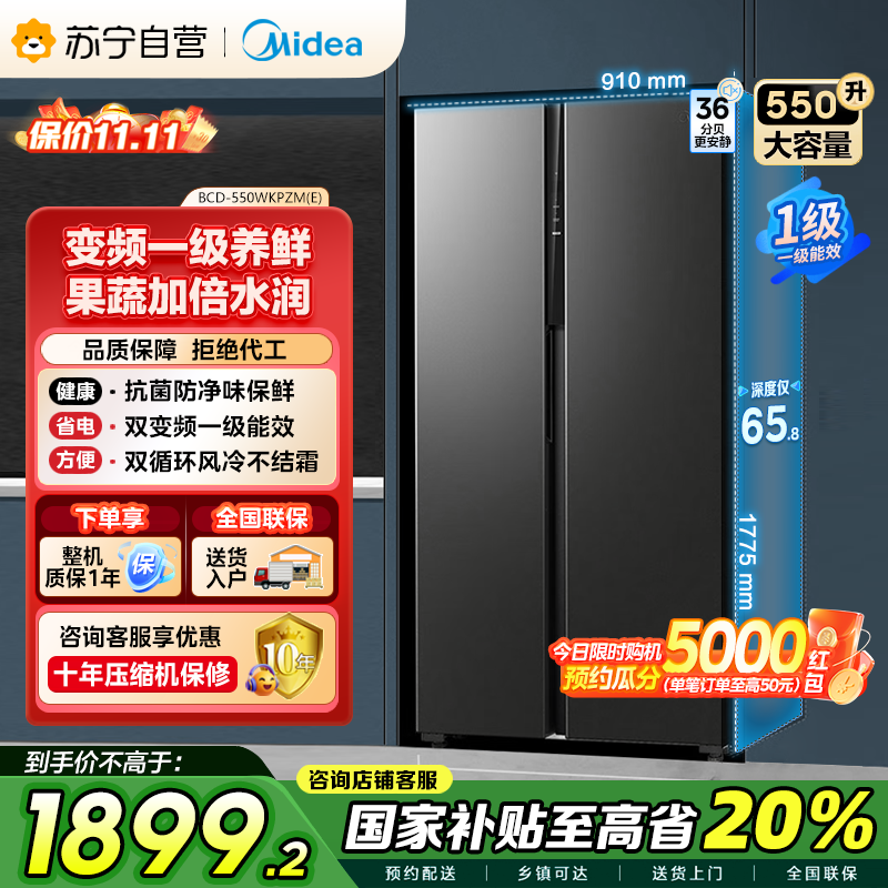 美的(Midea)550升对开门冰箱变频一级能效超薄家用电冰箱智能无霜净味BCD-550WKPZM(E)嵌入大容量