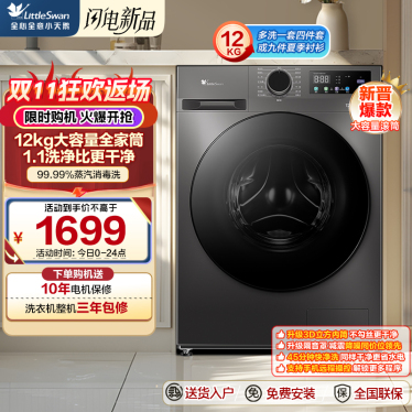 小天鹅(LittleSwan)12KG大容量变频全自动滚筒洗衣机 节能省电蒸汽消毒洗 一级能效 TG120V098WDT