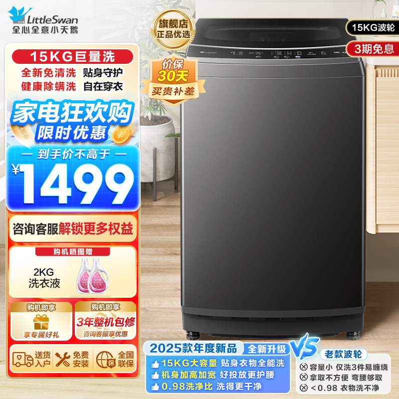 小天鹅(LittleSwan)波轮洗衣机全自动 15公斤大容量 免清洗不脏桶 健康除螨 以旧换新 TB15-1808T