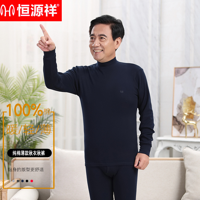 恒源祥秋衣秋裤纯棉薄款中高领男女保暖内衣套装中老年_63 165/90 藏青男