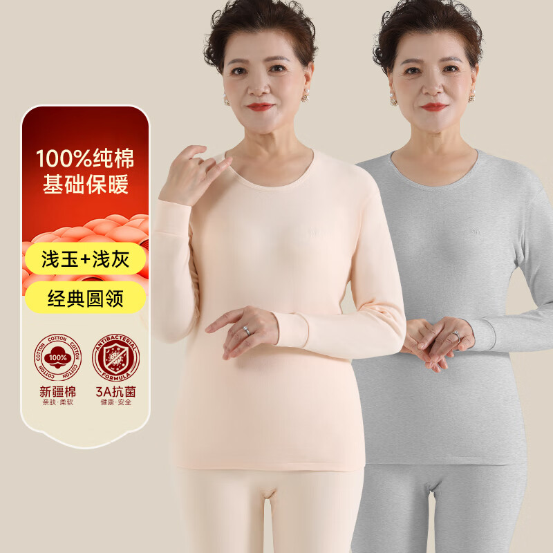 恒源祥老年人秋衣秋裤套装女秋冬季纯棉妈妈保暖内衣线衣线裤_210_412 160/S 【2套】-圆领浅灰+浅玉
