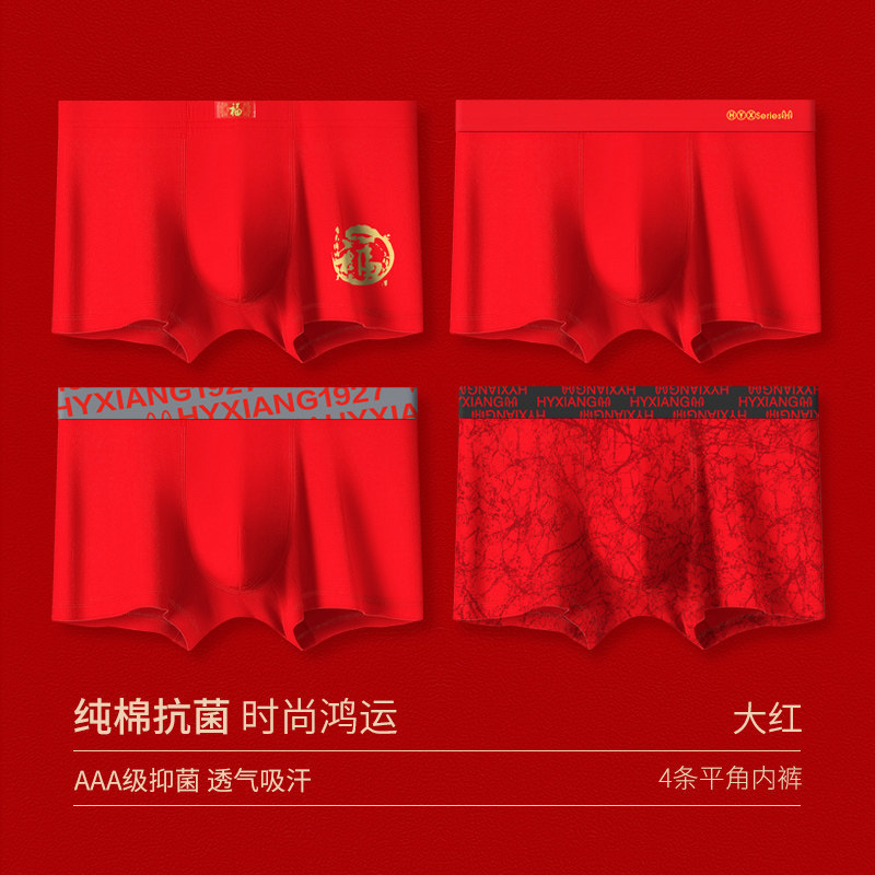 恒源祥本命年内裤男士平角纯棉大红色属虎年结婚四角短裤棉_798 170/L B款【4内裤】虎年大吉