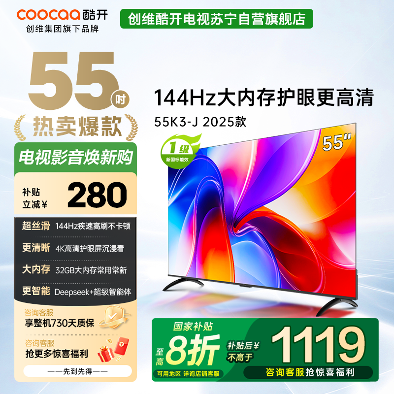 创维 酷开电视 55K3节能款 55英寸电视多重护眼 2+32GB 智能声控投屏电视 二级能效 政府补贴 55P3DGT