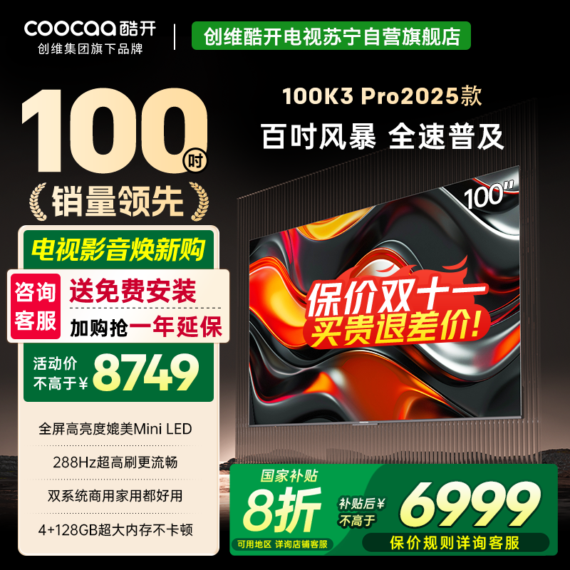 创维 酷开电视K3P Pro25款100英寸 288Hz deepseek护眼大内存商用系统100P3E Max