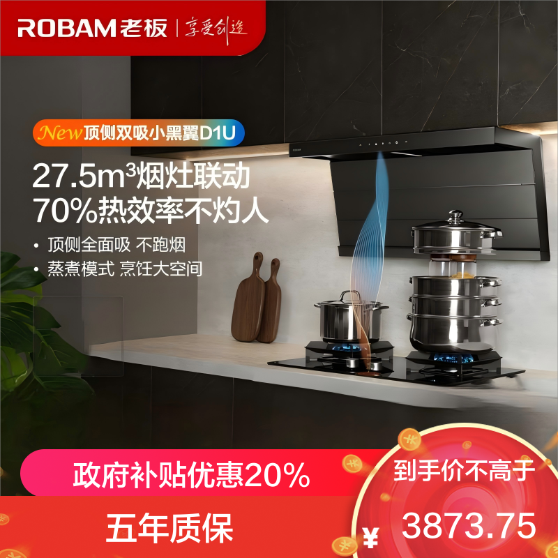 老板(Robam)[小黑翼D1U]油烟机超薄顶侧双吸 抽油烟机27.5风量大吸力吸油烟机可烟灶联动27A17-D1U