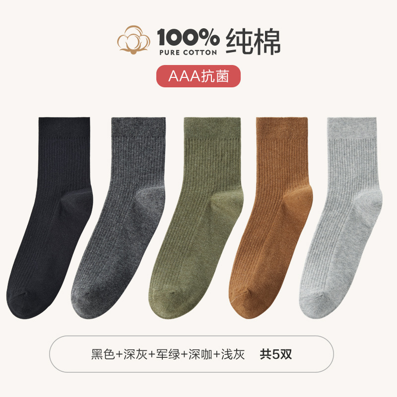 恒源祥袜子男纯棉秋冬季全棉中筒男袜商务加厚男士棉袜子 深色5双100%纯棉 均码