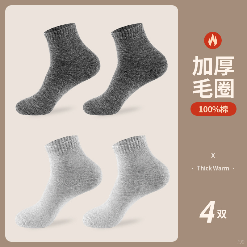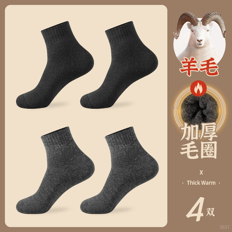恒源祥男士袜子冬季棉袜中长筒纯棉加绒加厚保暖毛圈袜男袜子冬天_49 均码【100%纯棉,加厚保暖】 3837【2黑色2深灰】羊毛男袜4双
