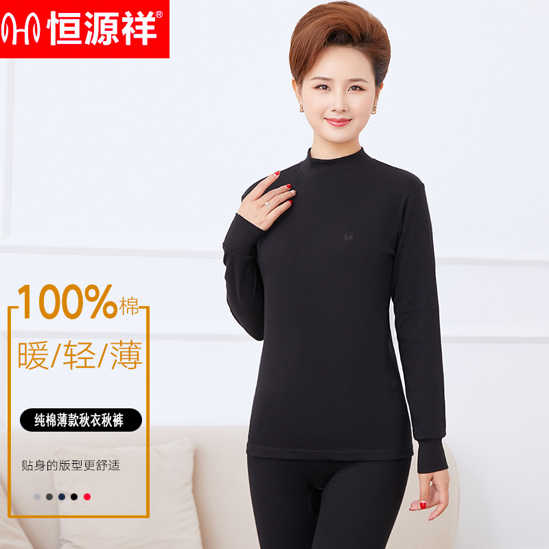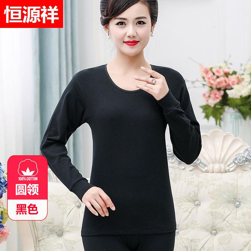 恒源祥女士中老年人保暖内衣套装纯棉棉毛衫男打底衫秋衣秋裤秋冬_951 170 女士-黑色(中领)