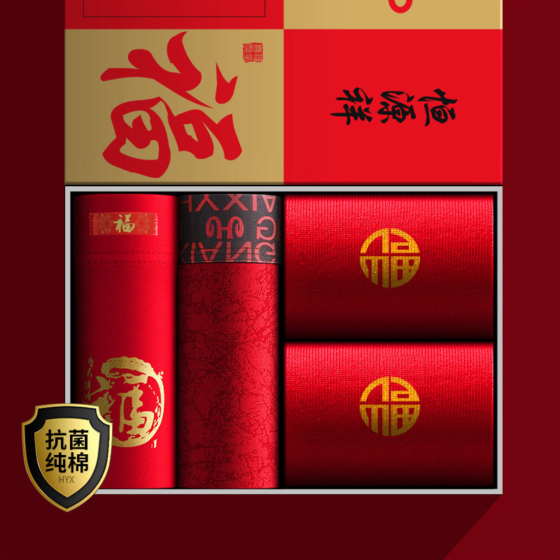 恒源祥纯棉男士内裤平角裤本命年牛结婚大红色全棉四角短裤头_374 175/XL 【步步高升】内裤2+袜子2