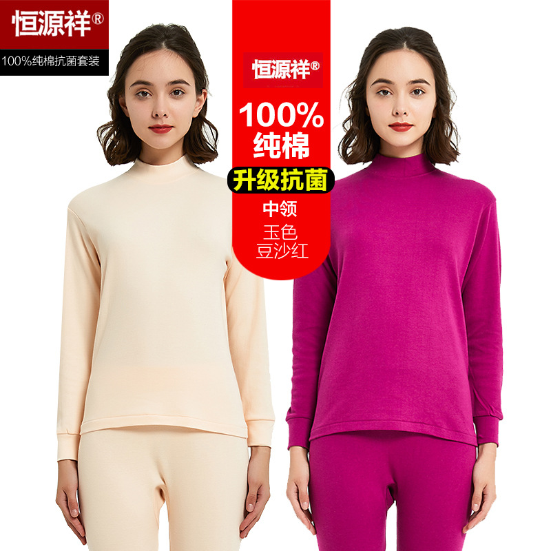 恒源祥女士秋衣秋裤纯棉半高领棉毛衫青年棉保暖内衣薄款套装秋_928_100 160/S 升级女士纯棉半高领(肤色+豆沙红)