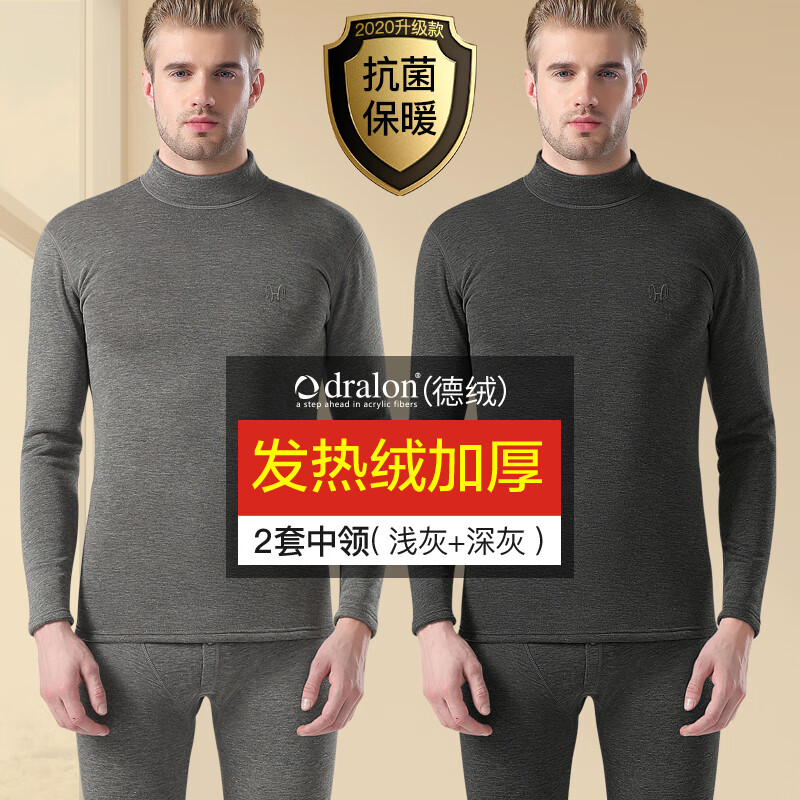 恒源祥男士套装加绒加厚德绒锁温保暖内衣纯棉秋冬季抗寒防风男款_494_164 170(L) 2套装中领【德绒加厚】浅灰色+深