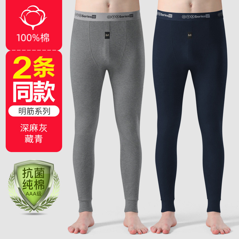 恒源祥男士纯棉秋裤保暖打底内穿全棉宽松薄款潮流毛裤线裤秋冬季 190/4XL 【明筋】深灰+藏青